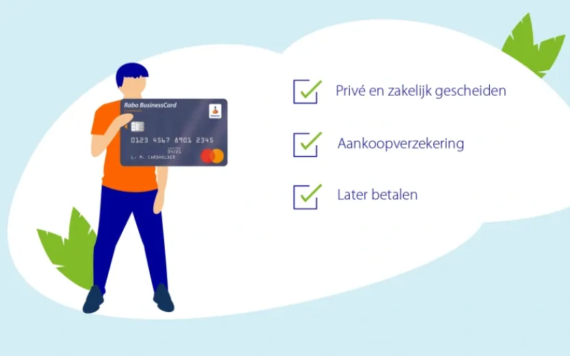 De Rabo BusinessCard is gekoppeld aan je zakelijke rekening. Deze zakelijke rekening open je eenvoudig in 5 minuten online of via de Rabo App. Alle aankopen die je daarna met je zakelijke creditcard doet, worden in één keer aan het einde van de maand van je zakelijke rekening afgeschreven.
