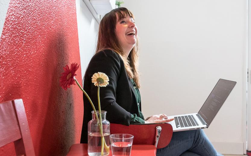 "Dat is het zeker. Deze kamer op de eerste verdieping heb ik gereserveerd voor ons gesprek.  Normaal gesproken werk ik beneden in de algemene ruimte en daar lunchen we ook met z'n allen. Ik heb er bewust voor gekozen om niet alleen maar thuis te werken, want dan komen de muren al snel op je af. Hier is altijd reuring en kom ik in contact met andere zelfstandigen. Dat heeft me zelfs al een paar keer een opdracht opgeleverd."